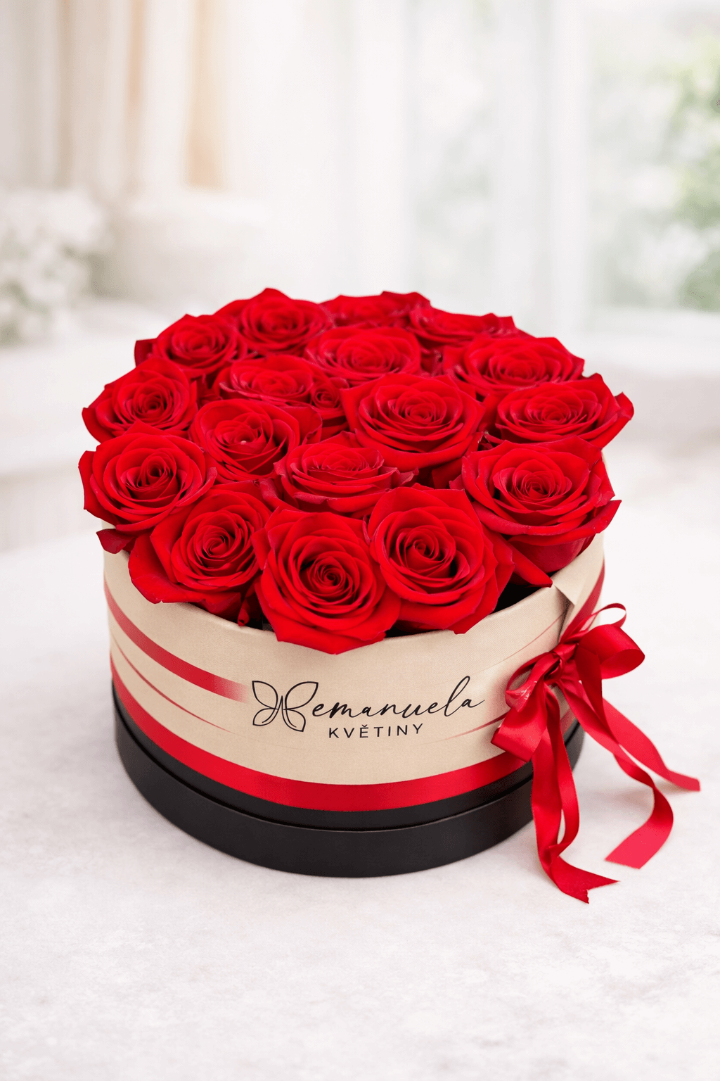 Elegantní květinový box plný sametově červených růží, které symbolizují úctu, radost i hluboké city. Nadčasové aranžmá v designovém boxu s červenou stuhou působí luxusně a reprezentativně – připravené rovnou k předání.